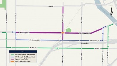 Motorists traveling westbound on Kennedy Boulevard will have to turn south onto Hyde Park Avenue, west onto Cleveland Street, north onto Howard Avenue, and proceed north toward Kennedy Boulevard.